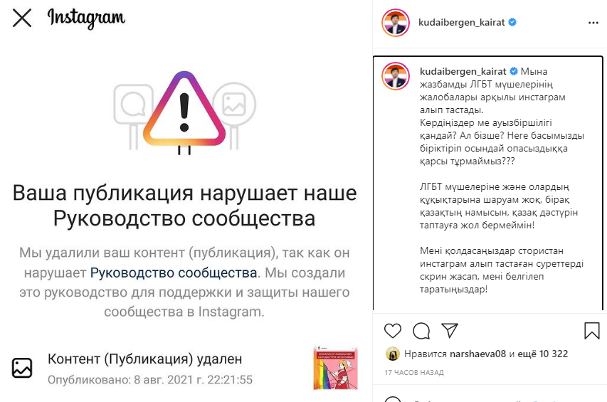 В то же время сам пост, который принёс художнице новую популярность, Instagram удалил, о чём Кайрат Кудайберген сообщил новым постом: