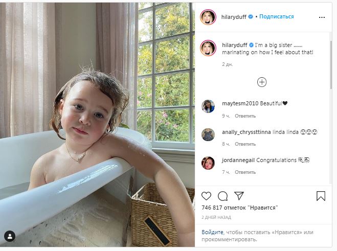 Хилари выложила фото своей младшей дочери Бэнкс, написав, что та стала старшей сестрой. Дафф пока не раскрыла пол и имя малыша, оставив подписчиков в неведении, пишет Glamour.ru