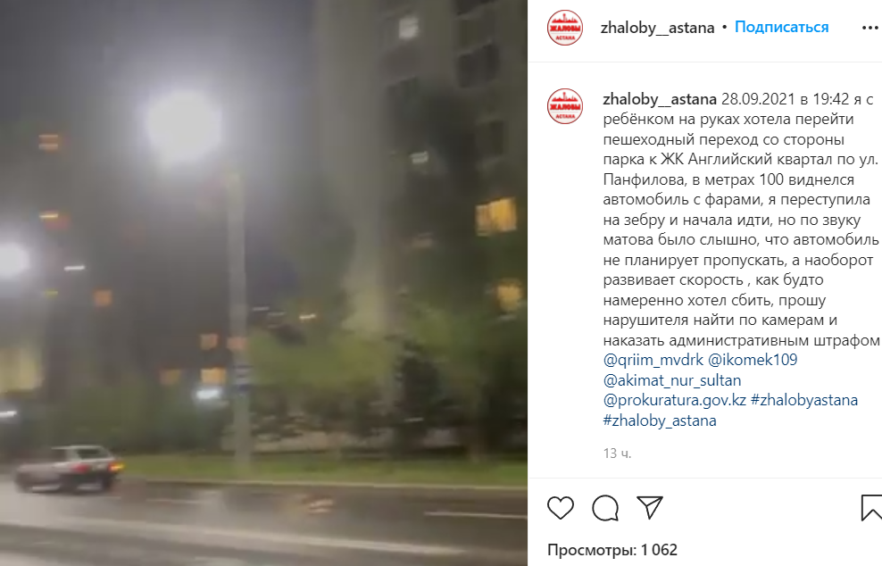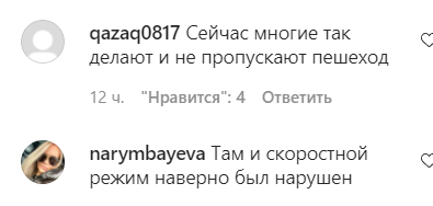 "Сейчас многие так делают и не пропускают пешеходов", "Там и скоростной режим, наверное, был нарушен", — пишут жители Нур-Султана в комментариях к жалобе.
