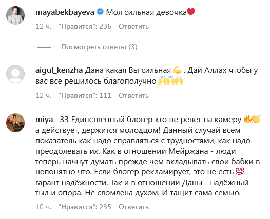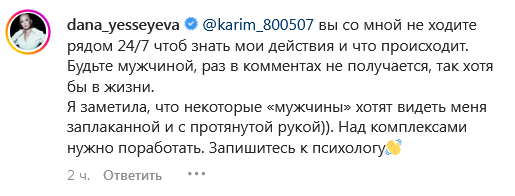 Дана ответила на два таких комментария. В ответ на первый блогер написала, что заметила, что некоторые "мужчины" хотят видеть ее заплаканной и с протянутой рукой, а потом заявила, что комментатору нужно проработать комплексы у психолога.