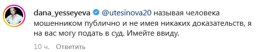 Второму Дана пригрозила судом за обвинение ее мужа, Мейржана Туребаева, в мошенничестве. На данный момент вайнер находится под арестом, его обвиняют в организации финансовой пирамиды. Недавно Мейржану Туребаеву продлили арест до 18 декабря.