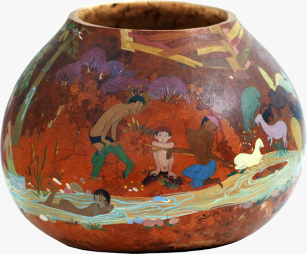 – Она несъедобная, из рода семейства тыквенных, ее научное название – лагенария, – поясняет автор. – Из них можно делать посуду, термос. Когда ее обработаешь, нальешь жидкость, она прекрасно держит высокую температуру. Раньше кочевники ее использовали в качестве термоса.