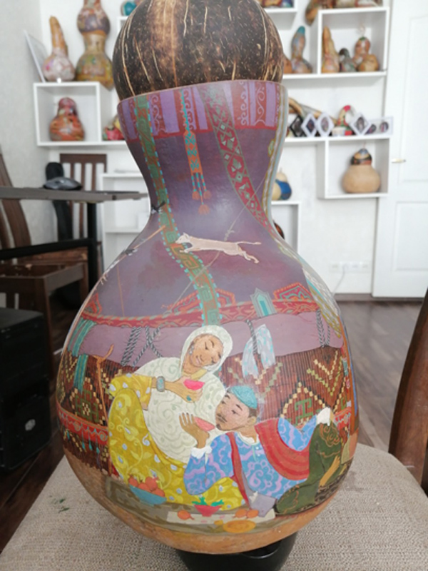 – С тыквами я работаю с 1982 года и по сей день их расписываю с удовольствием. Тыквы привожу из Кызылорды, раньше их выращивали мои сестры. Смотрю, выбираю по форме, затем сушу, чищу – у меня есть своя технология. А потом расписываю маслом. Что интересно, масляная краска очень хорошо ложится на тыкву, смотрится на этой поверхности красиво – она матовая, неблестящая. Потом за счет формы тыквы композицию можно рассматривать вкруговую. Также для своих работ я придумала оригинальные подставки в виде различных животных. Сейчас вот есть задумка найти 3–4 огромных тыквы и сделать роспись.