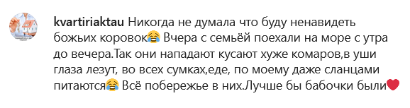 "В этом году было много дождей, как следствие, много зелени и тли, которая является основным рационом божьей коровки. Этим можно объяснить такое их количество. Никакой опасности для растительности и людей огромное количество этих насекомых не представляет", — сообщил "Ладе" старший преподаватель биологии университета им. Ш. Есенова Бисен Базаров.