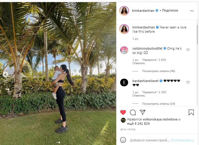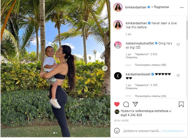 На размещенных в Instagram снимках 40-летняя знаменитость стоит в полный рост боком к камере, позируя на фоне пальм с младшим сыном Псалмом на руках. Она одета в черный спортивный топ и облегающие легинсы, передает zakon.kz.