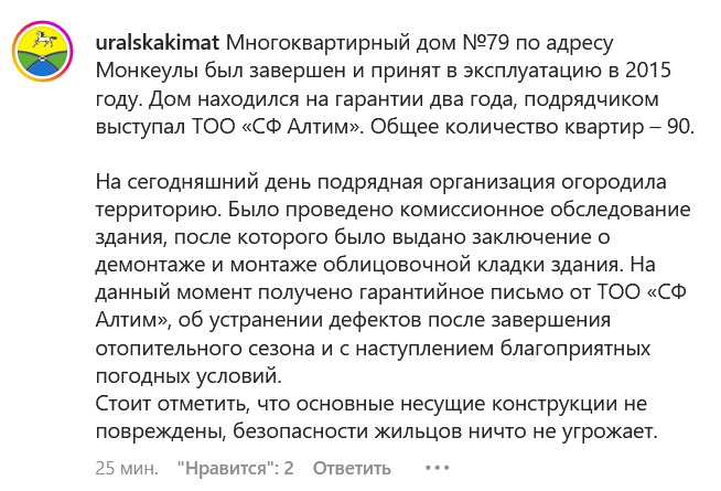 90-квартирный дом был сдан в эксплуатацию в 2015 году, передает медиа-портал Сaravan.kz. Представитель акимата Уральска сообщил, что власти уже занялись решением вопроса.