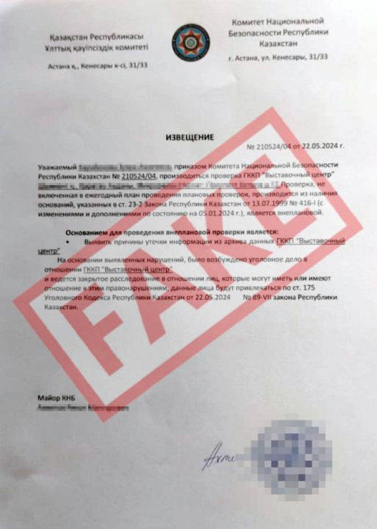 Нередко направляются файлы специально изготовленных документов с символикой КНБ (служебное удостоверение, фирменные бланки писем и приказов).