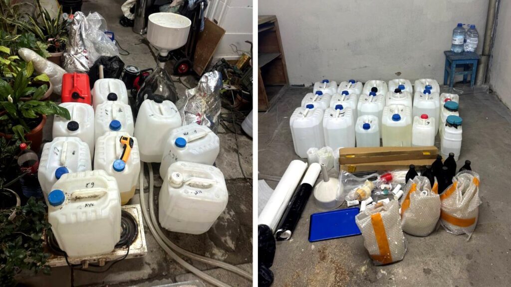 Обнаружено и изъято свыше 15 кг психотропного вещества «мефедрон» и 650 литров прекурсоров, а также лабораторное оборудование для изготовления наркотиков.