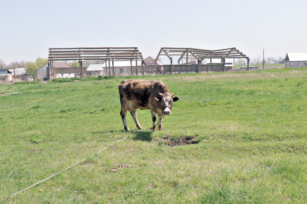 Следующей нашей точкой был поселок Кызылкайрат. Мы отправились к тому складу, на территории которого жила семья и выращивала овощи. Дом оказался пустой. Зато впритык к нему выросли новые строения. На загрязненном пестицидами поле пасутся коровы. Знают ли их владельцы об опасности, которая скрыта в зеленой траве, воде? Сомневаемся.