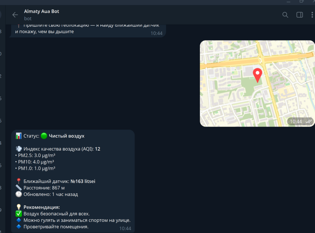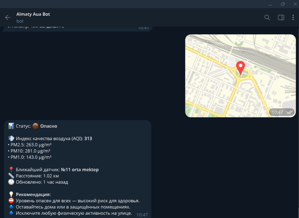 Бот использует данные air.org.kz и работает на данных более чем 170 датчиков. Пользователь отправляет геолокацию, и бот показывает AQI и пыль PM2.5 / PM10 / PM1.0 с ближайшего датчика. Он дает рекомендации, что можно и чего лучше избегать при текущем загрязнении. Пользоваться ботом можно на казахском, русском и английском языках.