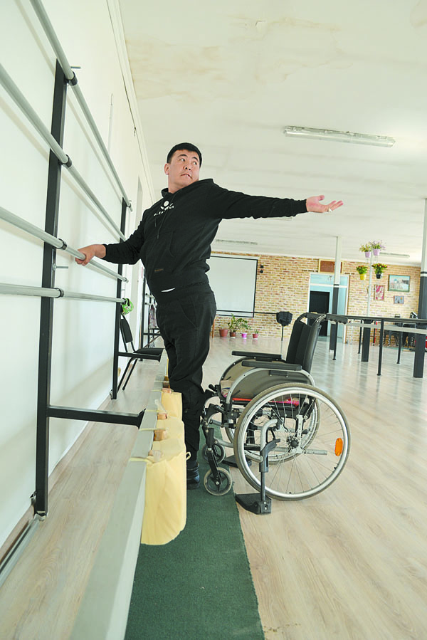 Рассказывая о работе центра, Еркинбай передвигается по просторному помещению на инвалидной коляске. С гордостью показывает тренажеры для тренировки отдельных групп мышц пациентов с нарушениями опорно-двигательного аппарата. У тренажера, напоминающего шведскую стенку, останавливаемся. Несколько секунд, и Еркинбай, уже на собственных ногах, самостоятельно проделывает упражнения. Казалось, в этом нет ничего необычного, если не знать предысторию.