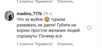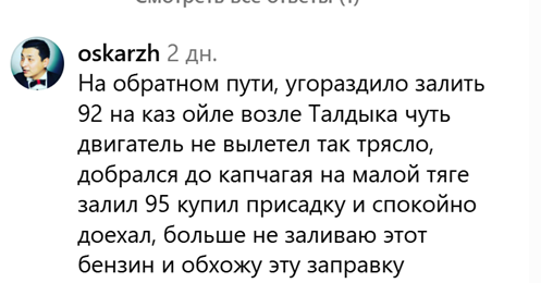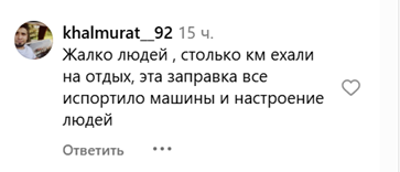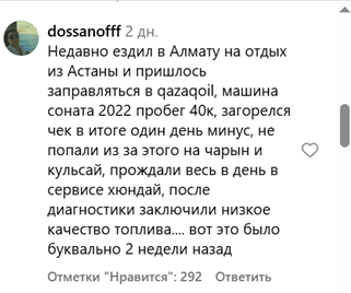 Другой пользователь, Dossanoff, жалуется, что после заправки вместо экскурсий на Кольсай и Чарын пришлось целый день потратить на автосервис. После диагностики специалисты дали заключение, что топливо было низкого качества. Многие комментаторы отметили, что пострадали туристы, ехавшие с семьями.