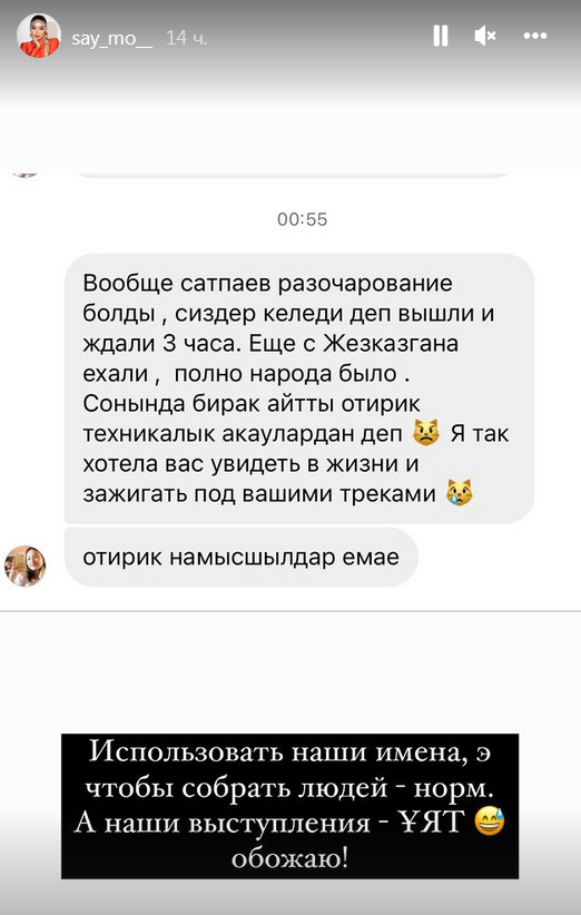 Также в Сети появилось обращение жительницы Сатпаева, которая просит отменить концерты Say Mo и Ninety One, так как эти музыканты выглядят и ведут себя, по ее мнению, неподобающе. Выыяснилось, что схожую позицию высказали многие представители старших поколений жителей города.