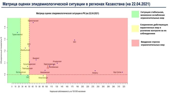 Согласно Матрице оценки эпидемиологической ситуации по COVID-19 в регионах Казахстана, по состоянию на 22 апреля сложилась следующая ситуация: