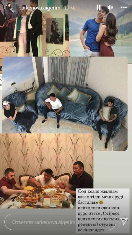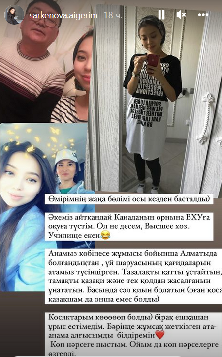 "Тогда началась новая глава моей жизни. Как и сказал отец мужа, я поступила не в Канаду, а в ВХУ, Высшее хоз. училище. Так как мама в основном была на работе в Алматы, хозяйственные обязанности мне разъяснял отец. Соблюдение абсолютной чистоты, еда казахская и только приготовленная собственноручно — вот что он одобрял. Вначале мне было сложно, к тому же я не слишком хорошо знала казахский язык. Косяков у меня мно-ого было, но ни разу не слышала ругательного слова. Я благодарна родителям за то, что они все доносили мне в мягкой форме. Я выросла во многих отношениях, и изменилось мое отношение ко многим вещам"", — написала Айгерим, приложив свои фотографии с родителями мужа.