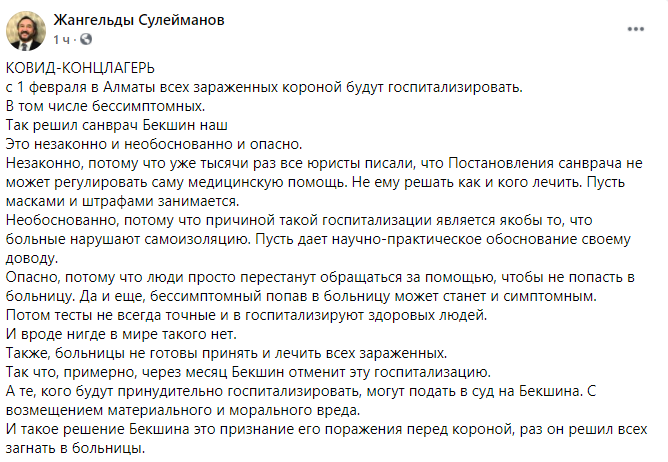 Новое постановление главного государственного санврача Алматы Жандарбека Бекшина назвали незаконным, передает Caravan.kz со ссылкой на страницу в Facebook известного казахстанского юриста Жангельды Сулейманова.