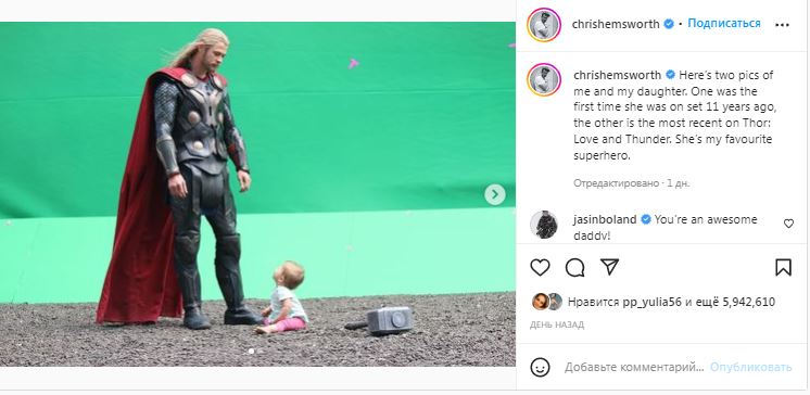 — Вот две фотографии меня и моей дочери. На одной из них она впервые была на съемочной площадке 11 лет назад, а на другой — совсем недавно, в фильме «Тор: Любовь и гром». Она — мой любимый супергерой , — подписал пост Крис Хемсворт.