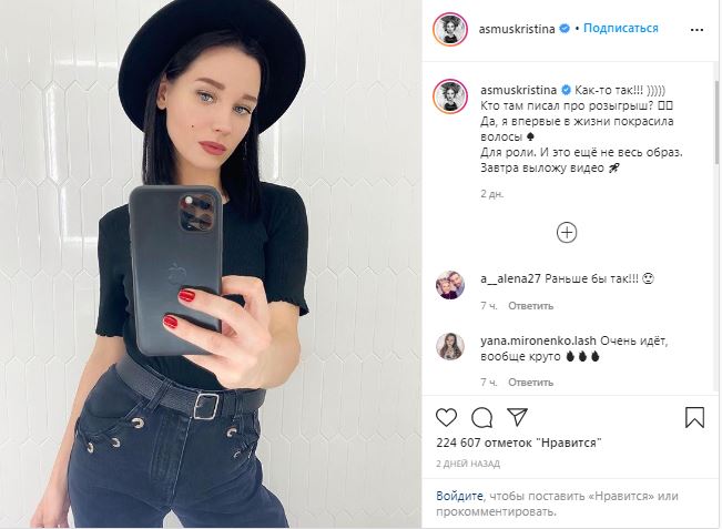 Она также поделилась видео, на котором можно увидеть, что у нее появилась челка. Асмус поинтересовалась у подписчиков, как они оценивают ее новую прическу. Большинство комментаторов отметили, что актрисе идет образ роковой женщины. Некоторые предположили, что она надела парик. При этом звезда не стала пояснять, для какого проекта она решила перекраситься в черный цвет.