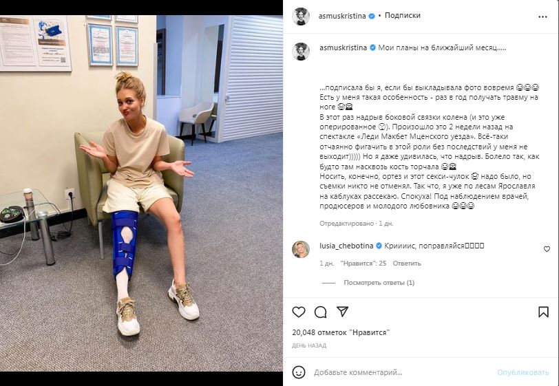 Инцидент произошел две недели назад во время спектакля «Леди Макбет Мценского уезда». Артистка получила надрыв боковой связки колена.