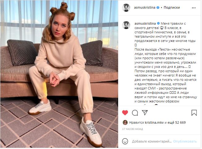 Свой пост Кристина Асмус посвятила Дню борьбы с кибербуллингом и попросила не обесценивать чувства человека, которого оскорбили в сети, не отвечать на негативные комментарии и не оскорблять в ответ.