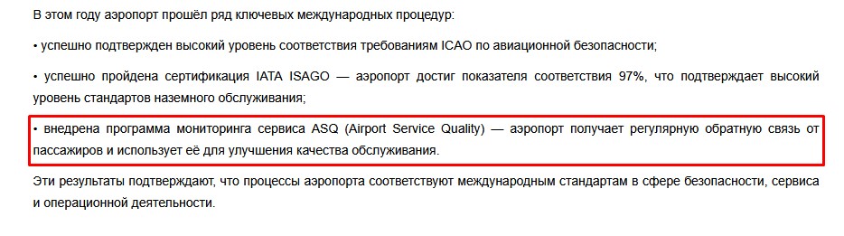 На сайте аэропорта, к слову, сказано, что в нем была «внедрена программа мониторинга сервиса ASQ (Airport Service Quality) — аэропорт получает регулярную обратную связь от пассажиров и использует её для улучшения качества обслуживания».