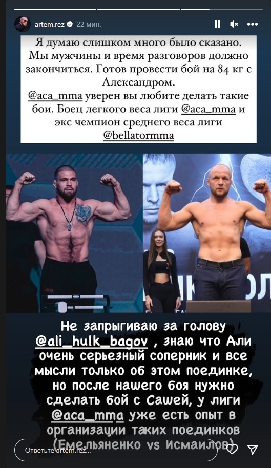 «Мне кажется, что Александру этот бой вообще неинтересен. Кто такой Артем? Неплохой середнячок, который выступает в легком весе АСА. Я сомневаюсь, что АСА или какой-то другой промоушен захочет платить Александру деньги за бой с Резниковым. Это просто такой ход. Он сам понимает, что этого боя не будет и пытается тем самым привлечь к себе внимание и показать, что он такой красавец и готов, если что подраться. Наверное, многие так бы сделали на его месте», — сказал Корешков в интервью MMA.Metaratings.ru.