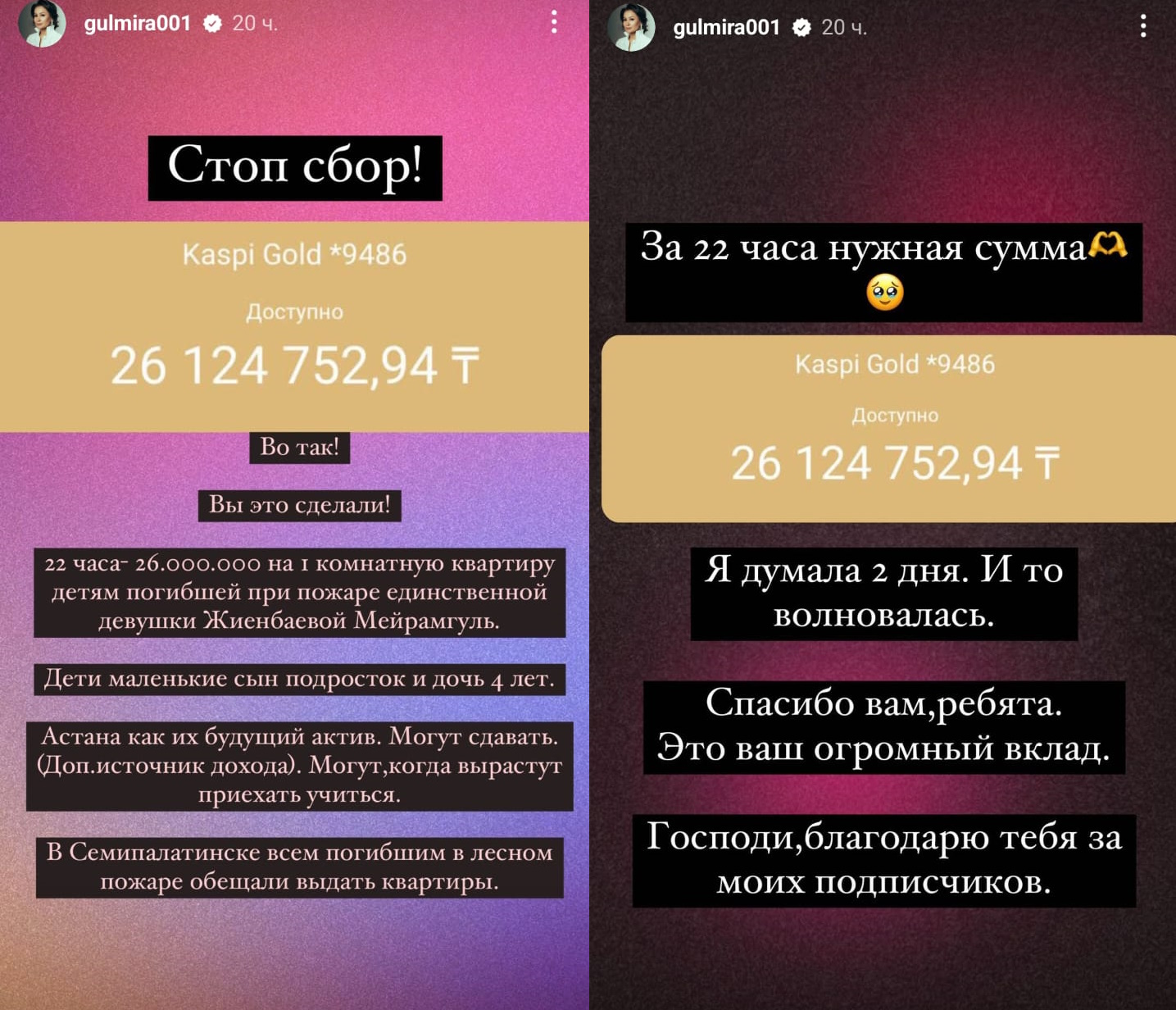 22 часа — 26 миллионов на однокомнатную квартиру детям погибшей при пожаре единственной девушки Жиенбаевой Мейрмагуль. Дети маленькие, сын-подросток и дочь 4 лет.