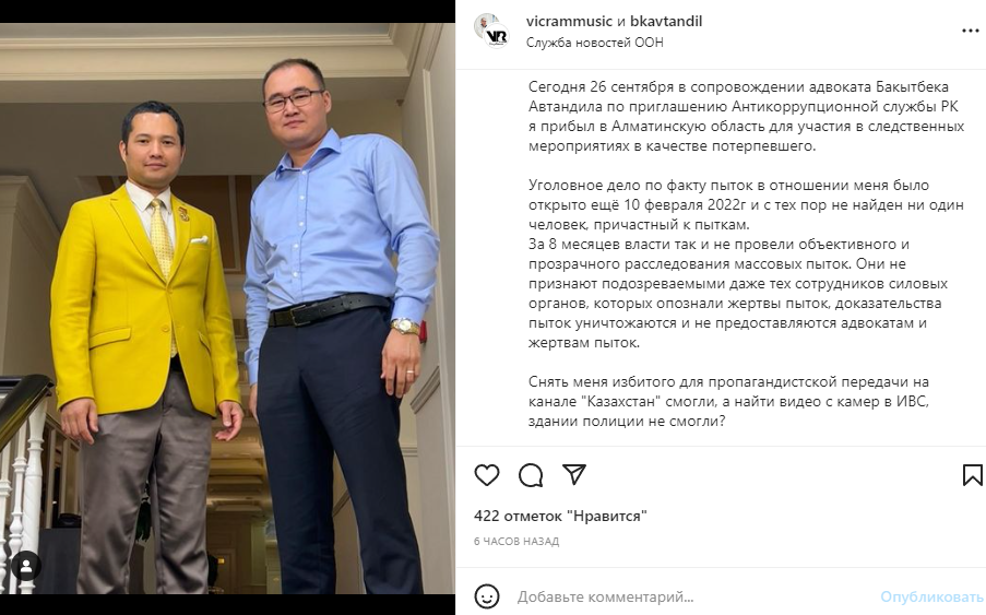 Музыкант сообщил, что 26 сентября прибыл в Алматинскую область в сопровождении адвоката Бакытбека Автандила. Он наконец-то принял приглашение Антикоррупционной службы РК и приехал для участия в следственных мероприятиях в качестве потерпевшего.
