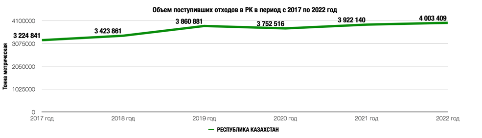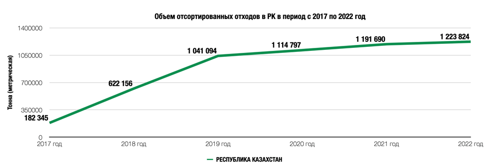Как у нас обстоят дела с мусором? На диаграмме ниже видно, что количество поступаемого мусора в период с 2017 по 2022 год увеличилось на 19,5 %. Согласно информации, представленной на сайте Egov.kz, страна в год производит около 4 миллионов тонн отходов. Эти отходы подлежат сортировке и переработке на производственных площадках разных городов, таких как Астана, Шымкент и Жанаозен, а также на предприятиях, принадлежащих среднему и малому бизнесу.