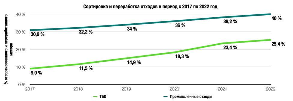 Относительно коммунальных отходов, их объем возрос на 13,6 % с 2021 года, достигнув отметки в 3 миллиона тонн. Однако доля утилизации и переработки этих отходов с 2018 года выросла в 2,5 раза, то есть в 2018 году было переработано 5,8 % отходов, а в 2022 – уже 13,5 %.