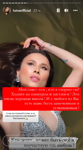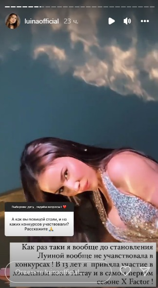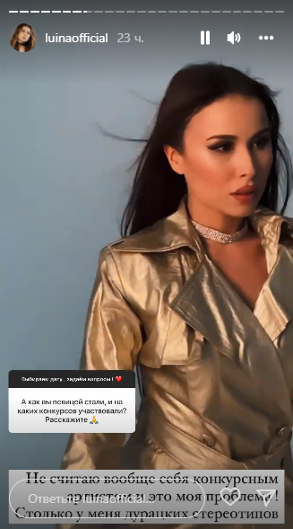 Луина ответила: "Как раз таки я вообще до становления Луиной не участвовала в конкурсах. В 13 лет я приняла участие в локальном конкурсе в Актау и в самом первом сезоне X Factor. Не считаю себя конкурсным артистом, это моя проблема! Столько у меня дурацких стереотипов".