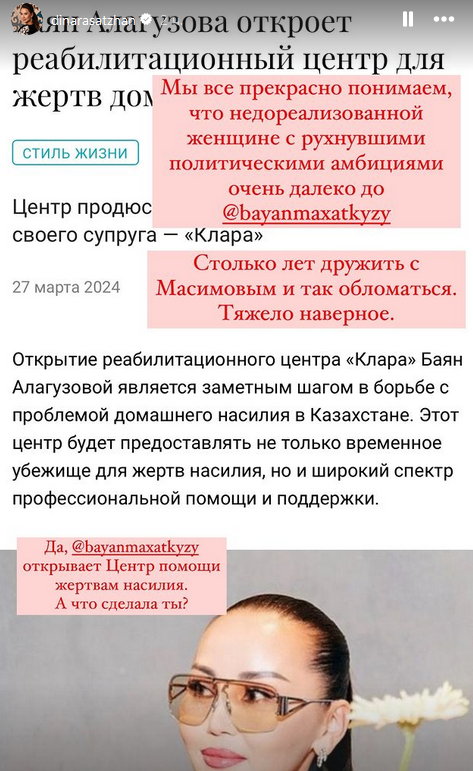 «Мы все прекрасно понимаем, что недореализованной женщине с рухнувшими политическими амбициями очень далеко до Баян Максаткызы. Столько лет дружить с Масимовым и так обломаться. Тяжело, наверное.