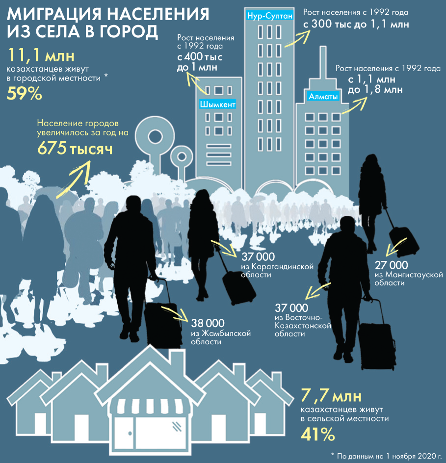 В 2019 году с места на место переехало более 1 миллиона 115 тысяч человек. Это население такого города, как Шымкент. Люди меняют село на город, город – на село, одну область – на другую. За прошлый год, с января по октябрь, прописку поменяли уже 675 тысяч человек. В принципе, это немного. Но не потому, что дома нашим согражданам живется хорошо. Причина банальна – карантин. 50 процентов всех внутренних мигрантов, 314 тысяч человек, покинули Алматинскую и Туркестанскую области, Нур-Султан и Алматы. Одновременно две столицы приняли на себя половину всего потока переселенцев.
