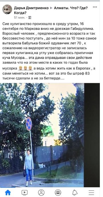 "Сие хулиганство произошло в среду утром, 16 сентября по Маркова вниз не доезжая Габидуллина. Взрослый человек , предпенсионного возраста и так бессовестно поступать, до нее мин за 10 тоже самое вытворила бабулька божий одуванчик лет 70, к сожалению на видеорегистратор не записалась первая хулиганка, на углу уже собралась приличная куча Мусора… эта дама оправдывая свои действия заявила что на этом месте в каких то годах была мусорка ???????????????????????? а ведь хотим жить как в Европах , а сами меняться не хотим… вот за это бы штраф 83 тысячи сделали а не за бетперде…. ", — написала она в Facebook.