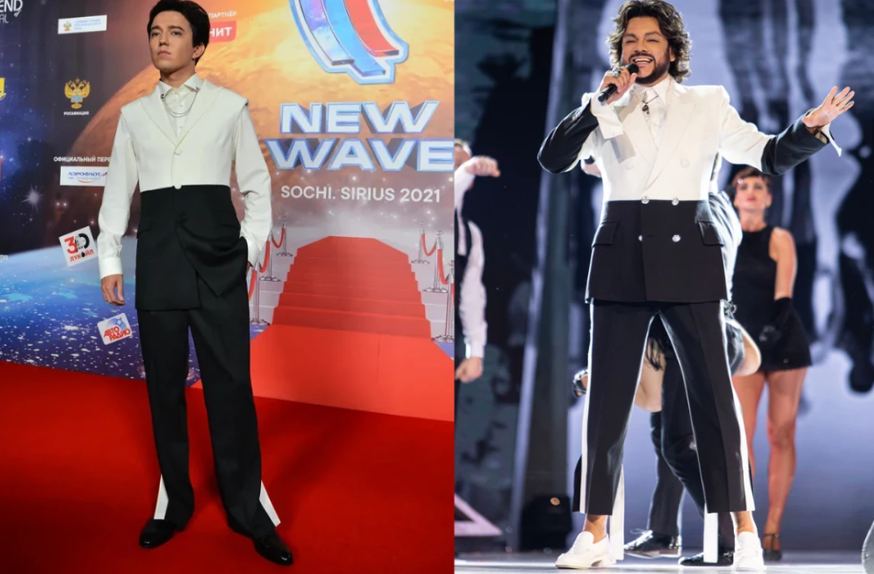 Филипп Киркоров слывет артистом, обладающим одним из самых ярких и эффектных стилей на российской эстраде, отмечало издание «Киноафиша». Певец регулярно удивляет поклонников смелыми образами, а фанаты пристально следят за каждым публичным появлением музыканта и не оставляют без внимания все его образы. И именно поклонники обнаружили, что наряд Димаша Кудайбергена на «Новой волне» в прошлом году практически полностью повторяет образ Киркорова на том же фестивале два года назад. Так, молодой артист выбрал черно-белый костюм, пиджак которого делится пополам цветовой границей. В похожем выступал Киркоров, исполнивший на сцене фестиваля «1000 лет». Единственная разница образов – обувь: король эстрады выступал в белоснежных лоферах, а Димаш остановился на черных лакированных туфлях.