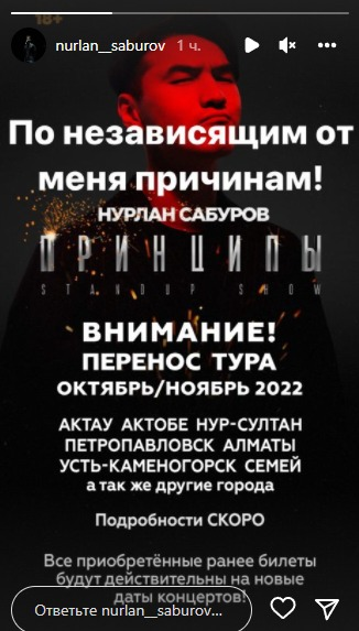 Комик Нурлан Сабуров в сториз в Instagram сообщил об изменениях в планах насчёт тура по Казахстану, передает медиа-портал Сaravan.kz.