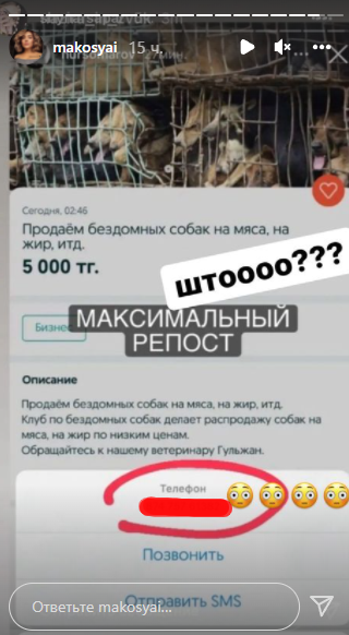 Артистка показала скриншот объявления, на котором написано: "Продаём бездомных собак на мясо, на жир и т.д. Клуб по бездомным собакам делает распродажу собак на мясо, на жир по низким ценам. Обращайтесь к нашему ветеринару Гульжан."