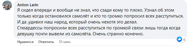 Просто бывает так, что родные сообщают плохую новость по телефону перед вылетом, бывает так, что 31-летняя девушка, мама двоих детей, от этих новостей стрессует, и бывает так, что в 1,5-часовом полете экипаж самолёта максимально не обращают внимание на человека, у которого спазм, который начинает задыхаться и терять сознание, и слава Всевышнему, бывает так, что на борту самолёта оказывается врач, уролог-андролог, который оказывает первую помощь, понимает, что вообще происходит, и все время полета контролирует ситуацию, держит больного в сознании и не даёт девушке получить инсульт или инфаркт.