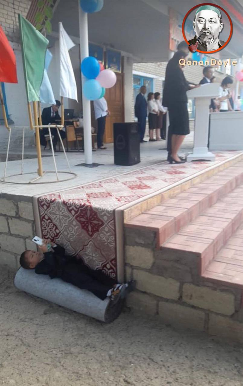 Казахстанцы распространяют фотографию мальчика в школьной форме, который лежит на свёрнутом ковре возле школьного порога во время торжественного мероприятия, передает медиа-портал Сaravan.kz.
