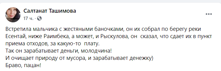 "Встретила мальчика с жестяными баночками, он их собрал по берегу реки Есентай. Сказал, что сдает их в пункт приема отходов за какую-то плату. Так он зарабатывает деньги, молодчина! И очищает природу от мусора, и зарабатывает денежку. Браво, пацан!" — написала участница группы Салтанат Ташимова.