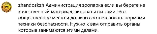 "В зоопарке 4 апреля в 17:40 произошел неприятный инцидент. Семья, посетившая зоопарк, проигнорировала предупреждения, написанные на табличках. Маленький ребенок (девочка) разбил стекло экспозиционного вольера, в котором содержатся приматы (обезьяны), несколько раз ударив его камнем, который она принесла с территории парка. Родители, увидев случившееся, спешно покинули зоопарк.