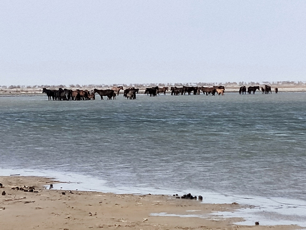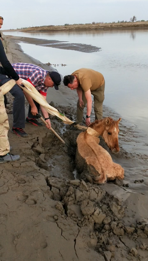 К вечеру 4 наших экипажа: “Куратор”, “Байконур”, “Кабан” и “Раптор”, пройдя Казалинск, расположились в кемпинге на берегу реки Сырдарьи. А тут нас ожидало непредвиденное обстоятельство: у самой кромки воды в речном иле увяз жеребенок. Оказалось, в этом месте табуны лошадей вброд переправляются на другой берег реки на пастбища. А малыш отстал от своей мамы, провалившись в непроходимую грязь. Недолго думая, мужчины “Qazaq Expedition Club” достали из походного снаряжения лопаты, трос и принялись освобождать попавшее в беду животное. Дело было не из легких, но после нескольких попыток откопали бедняжку из грязи, и маленькая кобылка потихоньку зашагала к своему табуну через кустарники (см. видео на сайте www.caravan.kz).