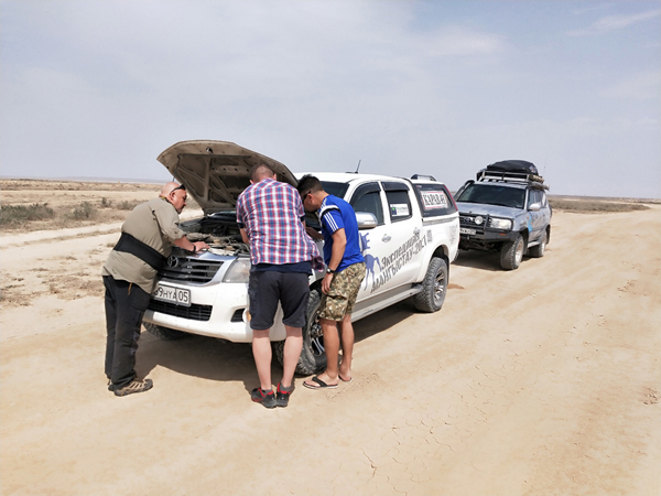 На четвертый день экспедиция будто попала под влияние “большого сглаза”. Наши “железные кони”, которые до этого безукоризненно выдерживали все испытания, вдруг один за другим стали давать сбои. На “Тойоте” экипажа “Байконур” отошла клемма аккумулятора. Починили в дороге. У “Питера” слетел привод с гранаты, пару часов пришлось простоять на СТО. У экипажа “Раптор” возникли сложности с газобаллонным оборудованием. Все поломки были удачно исправлены, машины помыты, и мы снова в пути.