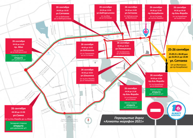 Старт и финиш марафона будут на площади Республики, поэтому по улице Сатпаева от улицы Желтоксан до проспекта Назарбаева будут перекрыты обе полосы движения с 06.00 25 сентября до 18.00 26 сентября.