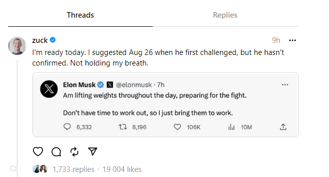 "Я готов уже сегодня. Я предложил 26 августа, когда тот бросил мне вызов, но он ее так и не утвердил", — написал Марк Цукерберг, приложив скриншот поста из другой социальной сети. Ранее Илон Маск написал в X (бывший Twitter): "Поднимаю тяжести в течение дня, готовлюсь к бою. У меня нет времени заниматься, поэтому я просто привожу их на работу".
