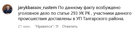 "По данному факту возбуждено уголовное дело по статье 293 УК РК (Хулиганство) , участники данного происшествия доставлены в УП Талгарского района", — сообщил начальник УП Талгарского района Рустем Джарыкбасов.