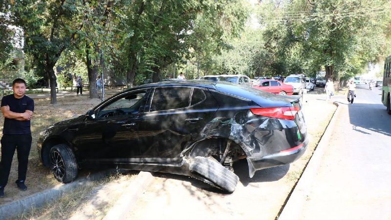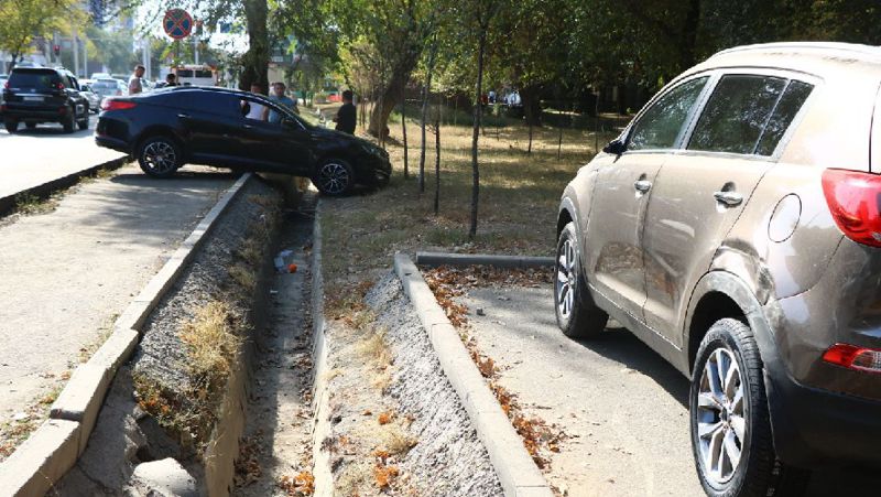 Водитель автобуса задел заднее крыло Kia Sportage, а также выломал зеркало легковому автомобилю. После этого жестко ударился в Kia Optima, от удара которую выбило с дороги. Водитель на Kia Optima вылетел через бордюр и остановился поперек арыка.