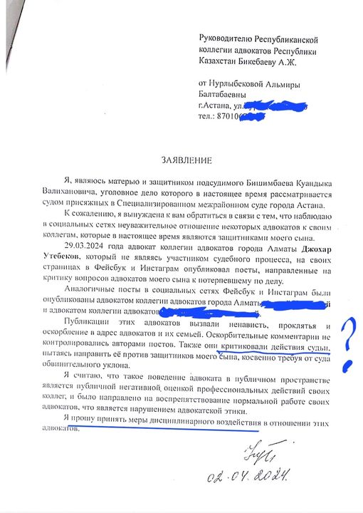Почему это Бишимбаевы защищают судью Кульбаеву? Почему они так заинтересованы в ней? Бишимбаевы еще недовольны тем, что я НЕ участник их процесса. Они хотят, чтобы я стал его УЧАСТНИКОМ? Они что, сами себе враги?" — написал известный двокат Джохар Утебеков, показав отсканированную копию заявления, поданного в республиканскую коллегию адвокатов.