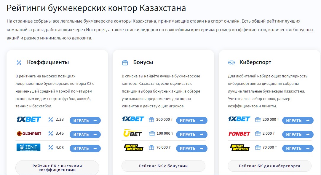 Рейтинги букмекерских контор Казахстана
