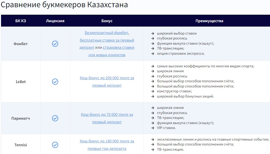 Табличка, в которую вписаны все легальные конторы Казахстана. Возле каждого букмекера — список преимуществ и информация о приветственных бонусах.
